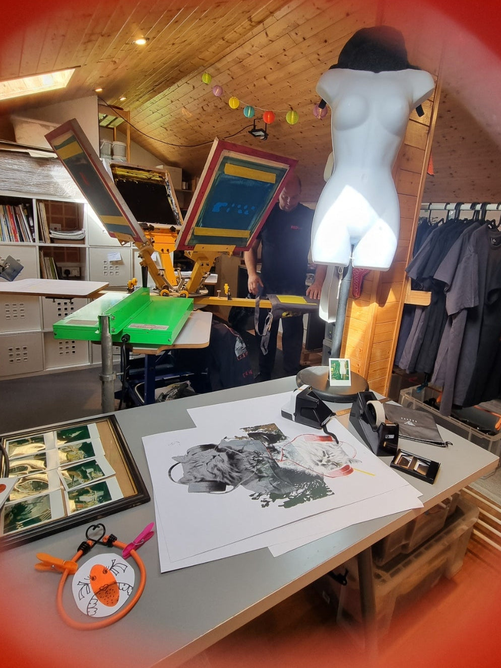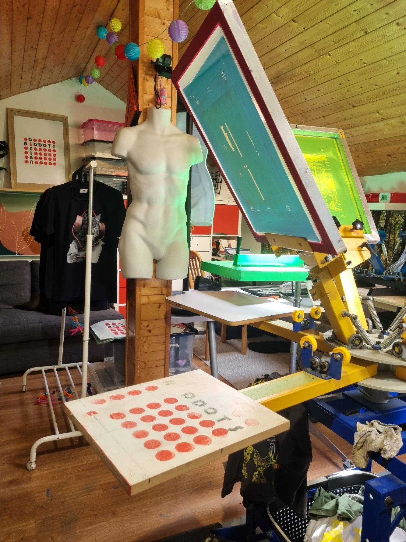 We don’t outsource. We don’t overproduce. We don’t follow trends. We’re a print studio that happens to put art on shirts (and totes, and posters, and whatever else we feel like printing that week). What we do is print — by hand, at home, with real materials and real limitations.